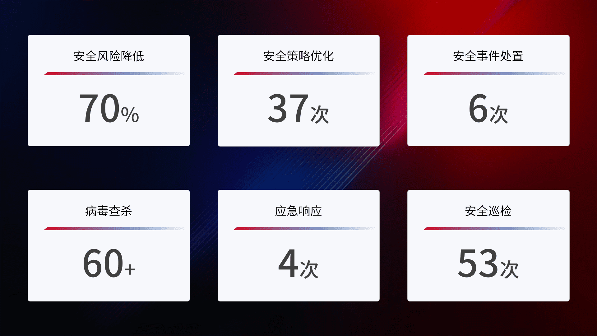 提供全面的安全事件报告体系,,包括处置报告、、、、周报、、季度和年度总结,,,结合持续监控,,,帮助客户深入了解网络安全状况。。。。
