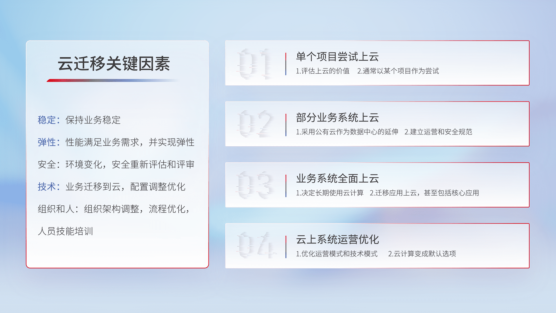 结合实际业务,,,,从规划设计、、云平台选型、、、云原生改造、、数据迁移、、集成交付,,,迁移全过程为客户识别最佳上云路径,,做好风险识别管理,,,设计网络架构、、、身份权限、、、、安全审计合规、、操作审计、、日志审计、、、、监控告警策略、、、多站点容灾设计等,,,对云上基础设施进行整体规划,,,,提升IT治理水平,,以满足弹性、、高可用、、、、高性能的需求。。。