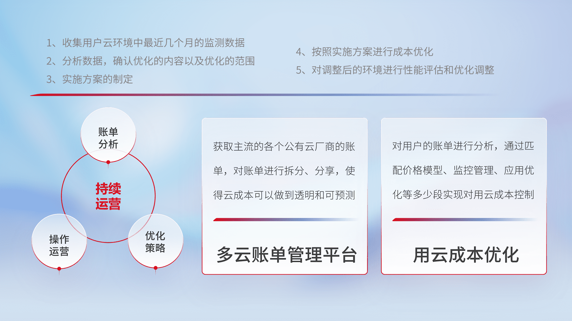 通过多云纳管,,,以统一的资源数据模型把客户的云资源进行抽象和封装,,,进而实现对多云资源的统一操作,,,保障云资源管理的可靠性、、、稳定性与可用性。。。。量身定制化运维内容,,配置、、、、开发运维、、、、补丁管理、、、备份、、、监控、、认证和访问管理、、、、审计和日常巡检等,,保障在用云过程中的可靠度,,,,稳定度以及高可用率。。